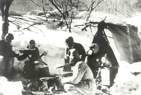 【战士们在战斗间隙吃冻土豆充饥】